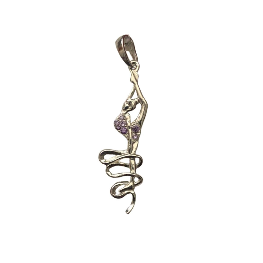 A beautiful handmade necklace that you will fall in love with! Sterling silver, adorned with white stones, it is of a beautiful gymnast performing with a ribbon. The pendant is sold with or without an adjustable silver chain and packed in a gift box.