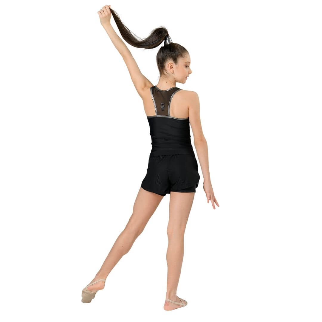 A tank top for rhythmic gymnastics and dance. Super stylish top with gold or silver trim is made from soft material, is breathable and is ideal for those with sensitive skin. Can be matched with shorts from the same "Gold and Silver" collection.